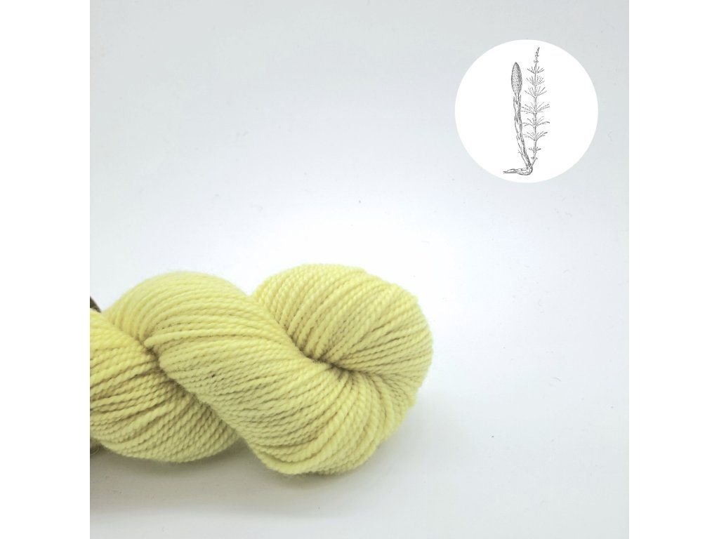 Velmi příjemná příze z fine merina obarvená výtažkem z přesličkové natě. Vyšší zákrut tvoří jemnou perličkovou strukturu.